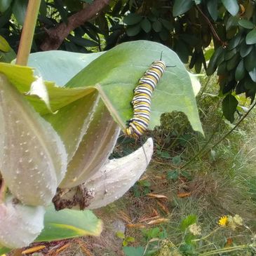 Milkweed is the ONLY plant that the Monarch Caterpillar feeds on. The Monarch Caterpillar has bright strips and smooth skin. They are easily seen when they are on the top of a Milkweed leaf. Tall grasses grow around the Milkweed Plants to give the caterpillars places to take shelter. The Caterpillars roam freely. We keep the yard and garden free of herbicides and pesticides.